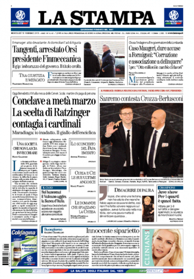 La maggior parte dei giornali di oggi apre con l’arresto per corruzione del presidente di Finmeccanica Orsi, notizia associata da qualche giornale alla chiusura delle indagini sulla sanità in Lombardia con la accusa nei confronti di Formigoni di corruzione e associazione a delinquere. Il Corriere della Sera, Avvenire e Europa rimangono invece sull’annuncio delle dimissioni di Papa Benedetto XVI e sulle prospettive in vista del prossimo conclave, e il Mattino titola su un’intervista a Bersani, che annuncia di non voler cercare un’intesa con Grillo dopo le elezioni. I quotidiani sportivi si occupano della vittoria della Juventus a Glasgow contro il Celtic nell’andata degli ottavi di finale di Champions League.