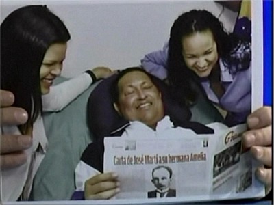 Il ministro della Comunicazione venezuelano Ernesto Villegas ha pubblicato oggi sul suo account di Twitter le prime immagini del presidente Hugo Chávez dallo scorso 11 dicembre, quando subì un intervento chirurgico in un centro medico dell’Avana, Cuba. Le foto ritraggono Chávez sorridente in compagnia delle figlie Maria Gabriela e Rosa Virginia, mentre legge il quotidiano cubano Granma.