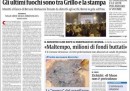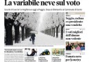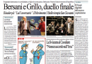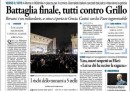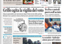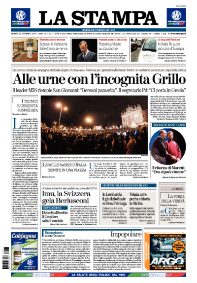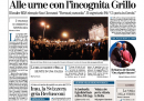 Gli ultimi appelli dei leader dei vari partiti nel giorno di chiusura della campagna elettorale sono in apertura su tutti i giornali di oggi: soprattutto il comizio di Beppe Grillo che ha riempito piazza San Giovanni a Roma, ma anche Bersani che ha chiuso in un teatro romano in compagnia di Nanni Moretti. Altre notizie presenti su molte prime pagine sono la liberazione su cauzione di Oscar Pistorius, la decisione del Papa di trasferire in Colombia il viceministro degli esteri vaticano Balestrero, e la smentita da parte della Svizzera di un accordo vicino sul rientro dei capitali, che era stato dato per imminente da Berlusconi per la sua ipotesi di restituzione dell’IMU.