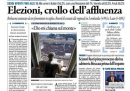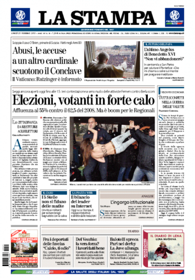 L’apertura di tutti i giornali di oggi è dedicata alla domenica elettorale: il calo dell’affluenza alle urne rispetto alle ultime elezioni e la contestazione a Berlusconi al seggio da parte di tre militanti del gruppo Femen sono le notizie di cui si occupano i quotidiani. Molto spazio trova anche l’ultimo Angelus del Papa prima delle dimissioni, mentre i giornali sportivi commentano la domenica di campionato, con il pareggio nel derby di Milano e la vittoria della Juventus, che allunga in testa alla classifica.
