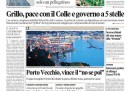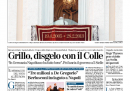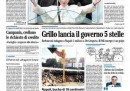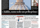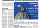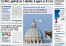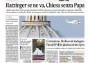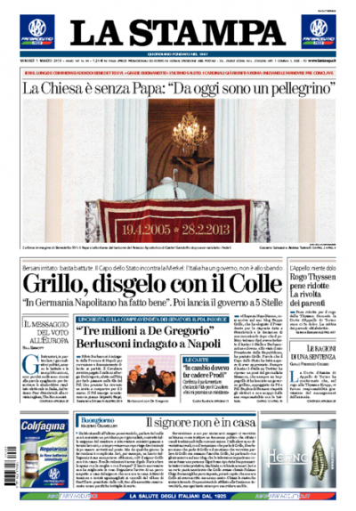 La notizia di apertura per tutti i giornali di oggi è l’ultimo giorno di pontificato per Benedetto XVI, che ieri pomeriggio ha lasciato definitivamente il Vaticano in elicottero per ritirarsi a Castel Gandolfo. Le uniche eccezioni sono Repubblica, che apre invece con un’intervista al segretario del PD Bersani che espone il suo piano per la formazione del prossimo governo, e il Giornale, che titola sulla nuova inchiesta su Berlusconi, indagato per la corruzione del senatore De Gregorio. I quotidiani sportivi titolano tutti sulla “notte scudetto”, la partita di stasera fra Napoli e Juventus.
