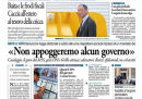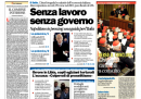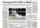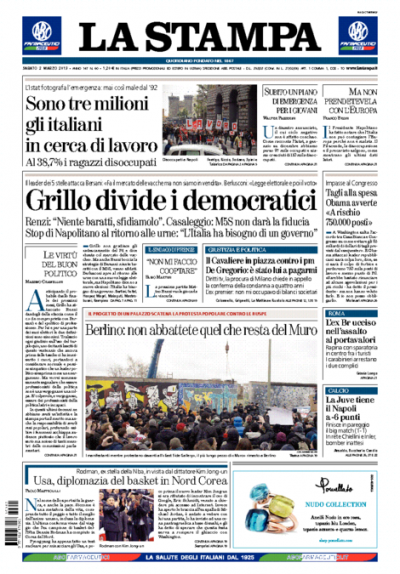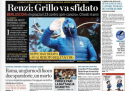 La maggior parte dei giornali di oggi aprono ancora sulle trattative per formare un nuovo governo, con le ulteriori dichiarazioni di Grillo e Casaleggio che negano la possibilità che il Movimento 5 Stelle voti la fiducia al governo e con l’intervento di Renzi che chiede al PD di sfidare Grillo sulle cose da fare per il bene del paese. Avvenire, il Manifesto e l’Unità titolano invece sui nuovi dati ISTAT sull’Italia con un nuovo record per la disoccupazione. I quotidiani sportivi commentano il pareggio fra Napoli e Juventus nella partita di ieri sera, che lascia la Juventus prima con sei punti di vantaggio.