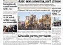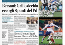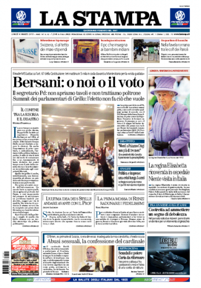 I giornali di oggi aprono ancora con le trattative fra i partiti per la formazione di un nuovo governo: ieri c’è stato l’incontro a Roma fra i parlamentari eletti del Movimento 5 Stelle, e Bersani ha proposto il suo programma in 8 punti per il nuovo governo, invitando Grillo a decidere se aderire o se mandare “tutti a casa”. I quotidiani sportivi commentano i risultati della domenica, con la vittoria in rimonta dell’Inter a Catania e il gol di Totti che raggiunge Nordahl al secondo posto nella classifica dei marcatori di tutti i tempi.