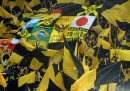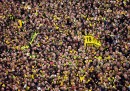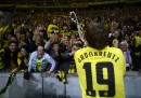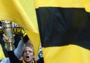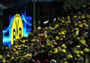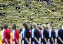 Prima che iniziasse la partita di ritorno degli ottavi di finale di Champions League tra Borussia Dortmund e Shakhtar Donetsk, giocata ieri e vinta dal Borussia per 3 a 0, circa venticinquemila persone hanno fatto la fila lungo gli ingressi della tribuna sud del Signal Iduna Park – per tutti, da sempre, il Westfalenstadion – portando con sé delle sedie di plastica, per prendere posto sulle gradinate di cemento e formare il “muro giallo”. Si è trattato di un caso particolare – le regole della UEFA richiedono di assistere alle partite negli stadi stando seduti – ma di solito i tifosi del Borussia Dortmund fanno il tifo in piedi. La loro curva è la più grande del mondo, non c’è mai un posto vuoto: per questo vengono definiti “il muro giallo” e sono una delle cose più belle e spettacolari del tifo calcistico europeo.
