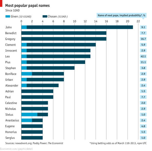 L’Economist ha messo insieme un grafico con l’elenco dei nomi più utilizzati dai papi, indicando anche la probabilità che uno di quei nomi sia scelto dal nuovo pontefice. Il nome più utilizzato è stato Giovanni, seguito da Benedetto e da Gregorio. Agli ultimi posti ci sono Eugenio, Onorio e Sergio.