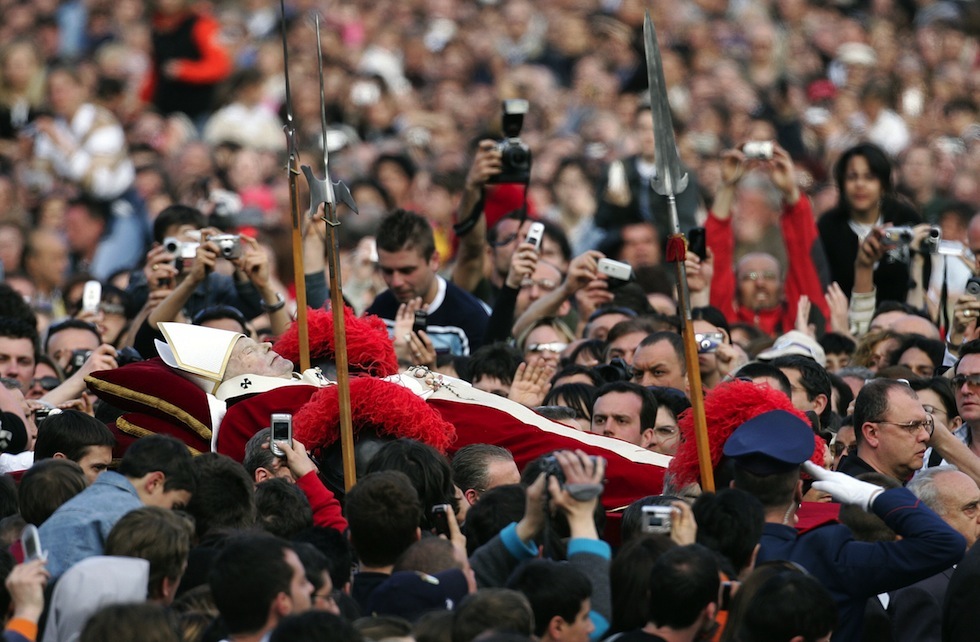 Facendo delle ricerche sulle agenzie fotografiche, poi, si scopre che anche durante il funerale non mancarono i momenti in cui moltissimi scattarono delle foto: qui sotto, per esempio, vediamo molte persone fotografare il corpo di Giovanni Paolo II mentre viene portato nella basilica di San Pietro dal Palazzo Apostolico.