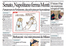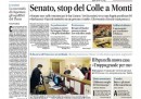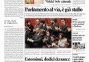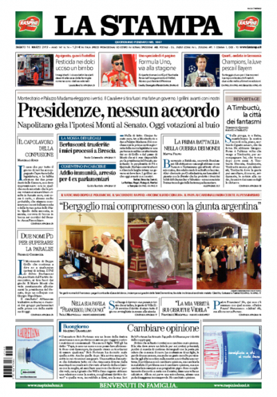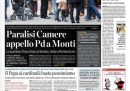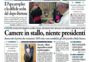 La prima giornata delle nuove camere, che non ha portato ancora all’elezione dei due presidenti, è in apertura su tutti i giornali di oggi, che sottolineano anche lo stop del presidente della repubblica Napolitano alla candidatura di Monti alla presidenza del senato. Altre notizie che si trovano su molte prime pagine sono la richiesta di Berlusconi di spostare i suoi processi a Brescia per legittima suspicione nei confronti del tribunale di Milano, la difesa da parte del Vaticano del nuovo papa riguardo ai suoi rapporti passati con la dittatura argentina, e l’ambasciatore italiano in India bloccato dal governo indiano per il caso dei due marinai italiani.