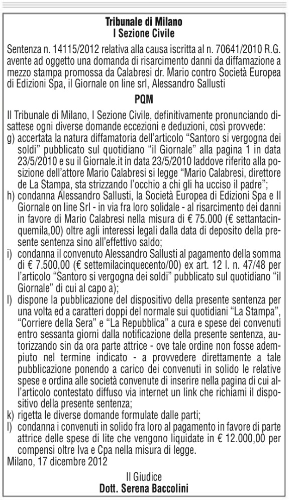 Sui giornali di oggi è pubblicata la comunicazione della sentenza con cui Alessandro Sallusti e il Giornale sono stati condannati a risarcire Mario Calabresi, direttore della Stampa, con 75.000 euro, per diffamazione.