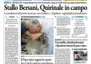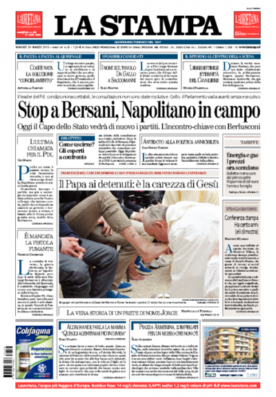I giornali di oggi aprono tutti con la decisione del Presidente della Repubblica Napolitano, dopo l’incontro di ieri con Bersani che ha esposto le “condizioni inaccettabili” postegli nelle trattative per formare un nuovo governo, di convocare le delegazioni di tutti i partiti oggi al Quirinale per verificare personalmente se ci sono le condizioni per una conclusione positiva dell’incarico a Bersani o per una soluzione alternativa che consenta la nascita di un nuovo esecutivo. Altre notizie presenti su molte prime pagine sono la visita in carcere di Papa Francesco, con la sua foto mentre lava i piedi ai detenuti, e ancora le polemiche fra il ministro Cancellieri e un sindacato di polizia sul caso Aldrovandi.