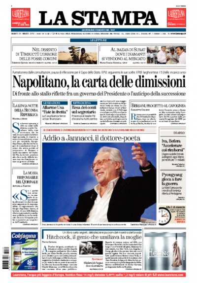 Tutti i giornali di oggi si occupano in apertura della giornata di consultazioni del Presidente della Repubblica per tentare di sbloccare le trattative per la formazione di un nuovo governo, al termine della quale Napolitano ha preso tempo di fronte alle posizioni contrapposte dei vari partiti: le due alternative indicate dai vari giornali sono l’incarico per la formazione di un “governo del presidente” o le dimissioni anticipate di Napolitano, per avere un nuovo Presidente della Repubblica che possa sciogliere le Camere. Su quasi tutte le prime pagine si trovano anche il ricordo di Enzo Jannacci e le immagini della prima via crucis celebrata da Papa Francesco.