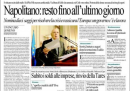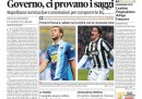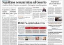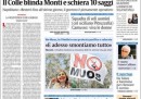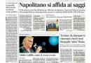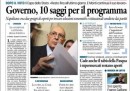La parola del giorno, nei titoli di prima pagina di oggi, è “saggi”: ovvero le dieci persone nominate ieri da Napolitano per definire “proposte programmatiche” utili alla formazione di un nuovo governo: anche se il rapporto di causa ed effetto tra le due cose non è ancora molto chiaro. La notizia dei “saggi”, insieme alle mancate dimissioni del presidente della Repubblica, è interpretata in modi molto diversi dalle prime pagine di oggi: c’è chi dice “Napolitano congela la crisi” e chi parla invece di “golpe di Napolitano”.