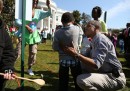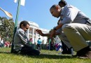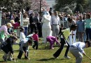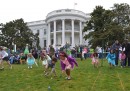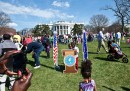 Come ogni anno la Casa Bianca ha organizzato ieri il tradizionale Easter Egg Roll, la corsa con le uova – bollite e decorate – che i bambini fanno rotolare sul prato servendosi di un cucchiaio dal lungo manico. Il presidente Barack Obama, la moglie Michelle e le figlie Sasha e Malia hanno accolto più di 30 mila ospiti nel prato sud della Casa Bianca: hanno giocato a basket e tennis con loro e letto favole come Piovono polpette e Chicka Chicka Boom Boom. Il tema della festa era Be Healthy, Be Active, Be You ed era ispirato a Let’s Move!, la campagna di Michelle Obama per promuovere la corretta alimentazione e l’attività sportiva tra bambini e ragazzi: molti allenatori e atleti professionisti erano presenti per giocare coi bambini e invogliarli a fare sport. Michelle Obama ha anche cucinato insieme a famosi chef americani piatti salutari e dato consigli ai genitori su come prepararli.