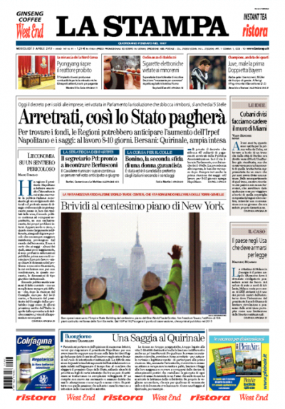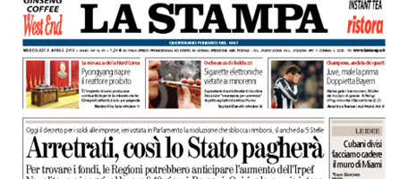 Sono due le notizie che si dividono le aperture sui giornali di oggi: gli sviluppi della situazione politica, con il primo incontro delle due commissioni nominate da Napolitano e l’apertura del segretario del PD Bersani alla ricerca di un candidato che trovi il sostegno di tutte le forze politiche per la presidenza della Repubblica, e il decreto del governo per sbloccare i pagamenti della pubblica amministrazione alle imprese, per finanziare il quale si teme la possibilità per le regioni di anticipare l’aumento dell’addizionale IRPEF. I quotidiani sportivi si occupano della sconfitta per 2-0 della Juventus contro il Bayern Monaco nell’andata dei quarti di finale di Champions League.