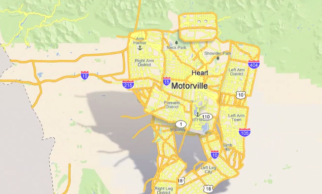 La mappa di una città americana si anima e muove alla ricerca di petrolio per nutrire il suo corpo fatto di vie, strade e autostrade. Un video di Patrick Jean.
