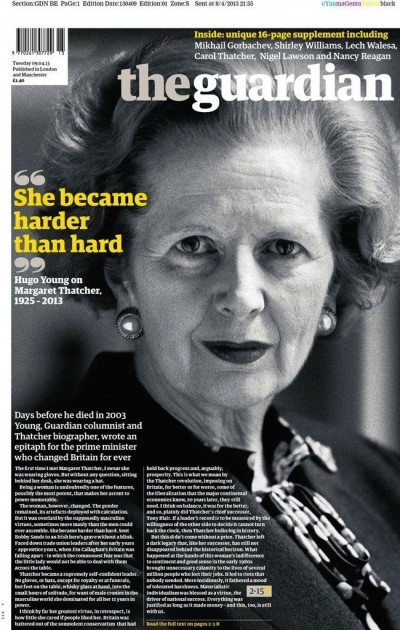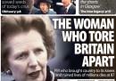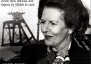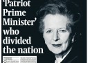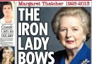 Margaret Thatcher, ex primo ministro britannico dal 1979 al 1990, è morta lunedì 8 aprile, a 87 anni, per un ictus. È stata un personaggio politico molto importante, rieletta tre volte alla guida del paese con il partito conservatore (1979, 1983, 1987), molto popolare ma anche discussa per le sue politiche economiche liberiste. Tutti i giornali britannici oggi dedicano la loro prima pagina a Thatcher: molti scrivono di come abbia diviso una nazione, altri di come l’abbia cambiata, altri ancora di come l’abbia salvata.