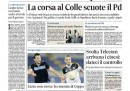 Le notizie di politica sono in apertura su quasi tutti i giornali di oggi, con le trattative fra i partiti per l’elezione del nuovo Presidente della Repubblica e le polemiche interne al PD fra Renzi e Bersani, mentre Repubblica apre con un’intervista a Berlusconi e l’Unità presenta il nuovo manifesto per il Partito Democratico di Fabrizio Barca. Il Corriere della Sera titola invece sulle preoccupazioni per i conti pubblici e il rischio di una nuova manovra economica, e il Manifesto, Avvenire e il Mattino si occupano del sequestro dell’area dell’ex Italsider di Bagnoli per la mancata bonifica ambientale della zona.
