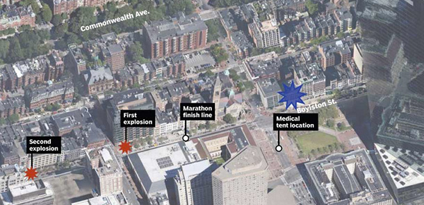 Due bombe sono esplose a circa 12 secondi di distanza l’una dall’altra nei pressi del traguardo della maratona di Boston, che era stato collocato lungo Boylston Street, storica via della città a ovest del centro. Le due bombe erano collocate a circa 170 metri di distanza e sono esplose alle 14:50 locali, le 20:50 in Italia. La prima era stata probabilmente collocata in un cestino per i rifiuti. I vincitori della maratona avevano già tagliato il traguardo almeno da un paio di ore, ma c’erano ancora diverse ondate dell’ultimo terzo di corridori attesi alla linea del traguardo.