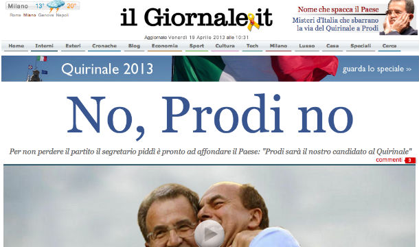 10.51 – Mario Monti ha appena confermato in conferenza stampa che il loro candidato è Annamaria Cancellieri, ministro dell’Interno uscente nel suo governo. Monti è anche stato molto duro contro il PD, definendo la candidatura di Prodi «eccellente ma divisiva» e dicendo che il PD «ha dato priorità a salvare il partito che a salvare il Paese». 10.42 – Romano Prodi, 73 anni, è stato l’ultimo presidente del Consiglio italiano di un governo di centrosinistra. Qui il racconto di come andò quando cadde, poco più di cinque anni fa, e non fu un bello spettacolo. 10.38 – L’apertura del sito del Giornale, adesso: