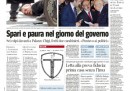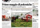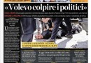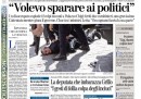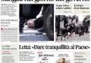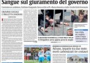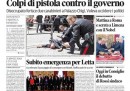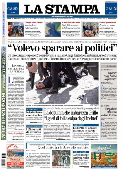 La sparatoria di ieri mattina davanti a Palazzo Chigi durante il giuramento del nuovo governo al Quirinale, che ha provocato il ferimento di due carabinieri, è in apertura su tutti i giornali di oggi. Molti sottolineano le parole di chi, soprattutto esponenti del PDL, mette in relazione il gesto dell’aggressore con la campagna contro i partiti del Movimento 5 Stelle, fino ad arrivare al titolo del Giornale che è piuttosto esplicito al riguardo. Sulle prime pagine si trova anche un accenno al programma del governo Letta, con i primi provvedimenti che dovrebbero riguardare l’IMU, il finanziamento della cassa integrazione e gli esodati. I quotidiani sportivi commentano la vittoria della Juventus, a un punto ormai dalla conquista dello scudetto, nel derby col Torino, e il grave infortunio al capitano dell’Inter Zanetti.