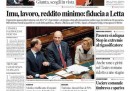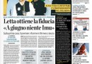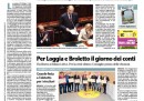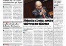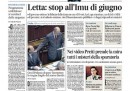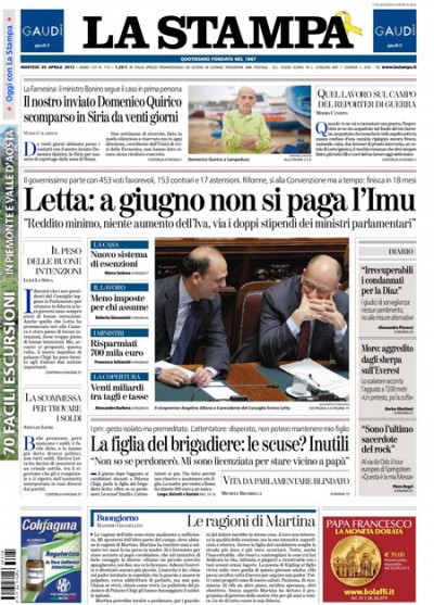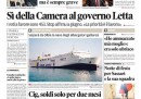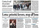 I giornali di oggi aprono tutti con il discorso del presidente del consiglio Letta alla Camera per il voto di fiducia al suo nuovo governo, concentrando i titoli sulle sue parole sul blocco dell’IMU da giugno e dell’aumento dell’IVA e sui provvedimenti per il mercato del lavoro. Solo Libero critica il suo discorso, definendolo una “favoletta” piena di promesse ma senza indicazioni sulle coperture finanziarie. Le altre notizie sulle prime pagine sono le parole della figlia del carabiniere ferito gravemente davanti a Palazzo Chigi domenica, e la mancanza di notizie da venti giorni dall’inviato della Stampa in Siria Domenico Quirico.