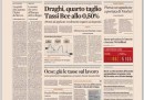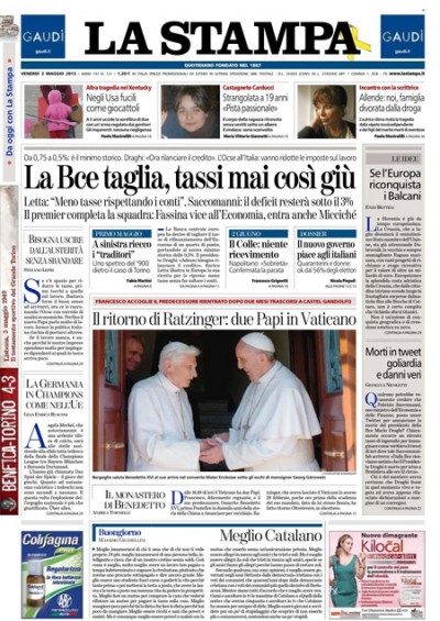Molti giornali di oggi aprono con la decisione della Banca Centrale Europea di tagliare i tassi portandoli a un nuovo minimo storico, lo 0,5%, e col richiamo dell’OCSE all’Italia a mantenere una politica di rigore economico. Il Corriere della Sera e il Secolo XIX titolano invece sulla nomina dei sottosegretari del governo Letta, decisa nel consiglio dei ministri di ieri sera, il Giornale critica le parole di Becchi, intellettuale vicino al Movimento 5 Stelle, sul ferimento dei carabinieri davanti a Palazzo Chigi, Libero prevede già la fine del governo Letta, e la Stampa ha una doppia prima pagina, con un inserto per la giornata mondiale per la libertà di stampa dedicato a Domenico Quirico, il suo inviato scomparso in Siria.