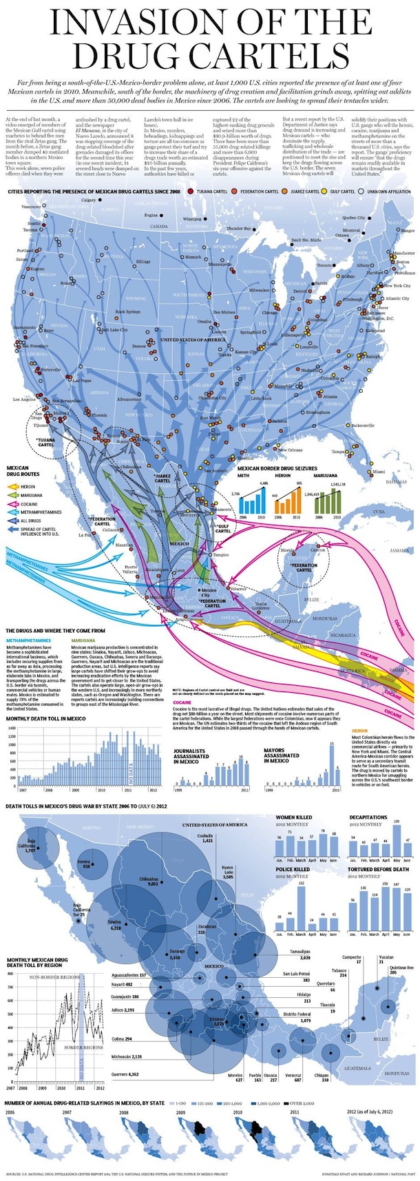Il canadese National Post ha realizzato un’infografica molto dettagliata che evidenzia l’estensione dell’influenza dei cartelli della droga messicani nelle diverse città americane, oltre ad indicare l’intensità e la direzione dei flussi di metanfetamine, cocaina, eroina e marijuana, tutte droghe che in una maniera o nell’altra passano dal Messico prima di superare il confine e riversarsi in territorio americano.
