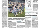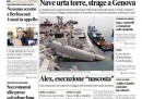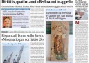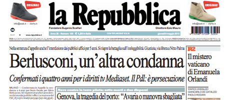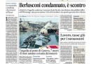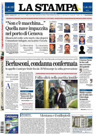 La sentenza di appello del tribunale di Milano con cui è stata confermata la condanna a quattro anni per Silvio Berlusconi nel processo sui diritti tv Mediaset si divide le aperture dei giornali con le notizie sull’incidente al porto di Genova. La prima notizia è molto criticata dal Giornale, che parla di “sentenza impresentabile”, e da Libero, che sottolinea i possibili effetti sulla tenuta del governo, mentre Repubblica mette in evidenza che si tratta di “un’altra condanna”. I quotidiani sportivi commentano i risultati della giornata di campionato di ieri sera e salutano le dimissioni di Alex Ferguson dal Manchester United dopo 27 anni.