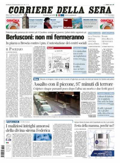 Ci sono due notizie principali che si dividono le prime pagine di oggi: l’elezione di Epifani a nuovo segretario del Partito Democratico, al termine dell’Assemblea nazionale del partito a Roma (ma la notizia era data già per sicura ieri) e la manifestazione del Popolo della Libertà a Brescia, con gli attacchi di Silvio Berlusconi alla magistratura. Alcuni quotidiani nazionali danno spazio al caso di cronaca nera avvenuto ieri mattina a Milano, in cui un uomo, un cittadino ghanese di 31 anni, ha colpito cinque passanti con un piccone, uccidendone una.