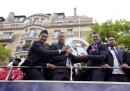 Le foto delle parate contemporanee di oggi per festeggiare le vittorie nei campionati di calcio spagnolo, inglese e francese