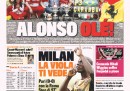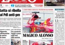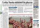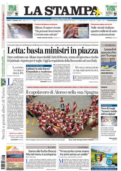 Il richiamo ai ministri del Presidente del Consiglio Enrico Letta a non partecipare a comizi o a trasmissioni televisive elettorali, dopo le polemiche sulla partecipazione di Alfano e altri ministri del PDL alla manifestazione di sabato a Brescia, è in apertura sulla maggior parte dei giornali di oggi. Il Giornale si occupa invece del processo Ruby e della “persecuzione giudiziaria” a Silvio Berlusconi, mentre i quotidiani sportivi titolano sulla vittoria di Fernando Alonso nel gran premio di Spagna di formula uno.