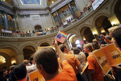 Due anni fa, quando il disegno di legge sui matrimoni gay venne proposto, la Camera dei Rappresentanti e il Senato del Minnesota erano controllati dai repubblicani. I repubblicani avevano tentato di introdurre nel testo della Costituzione il divieto del matrimonio tra persone dello stesso sesso. Ci furono una grande campagna e una forte mobilitazione contro l’approvazione di questa norma che portarono, nel novembre 2012, a un referendum: il 51,3 per cento dei cittadini e delle cittadine del Minnesota scelse di respingere la proposta. Il referendum e le successive elezioni hanno consegnato Camera e Senato del Minnesota ai democratici.