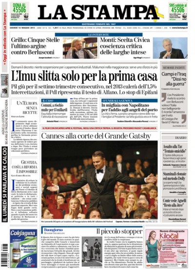 Il PDL ci riprova con le intercettazioni, il rinvio dell'IMU solo per la prima casa, e l'apertura del Festival di Cannes