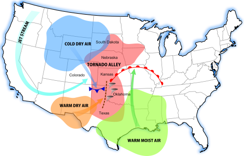 La Tornado Alley è il nome ufficioso di una zona centrale degli Stati Uniti che si estende in altezza circa dall’Ohio al Texas. In essa l’aria calda e umida proveniente dal golfo del Messico viene “schiacciata” tra due correnti di aria più secche, una proveniente dalle montagne rocciose, da ovest, e dal resto del continente americano, a est. Questa condizione è la più favorevole per la nascita dei tornado. Quando queste masse d’aria si incontrano, spesso generano un temporale molto forte e caratterizzato da potentissimi vortici d’aria, che a loro volta possono generare un tornado. Semplificando molto, i territori al centro del continente americano nei quali più spesso capitano dei temporali hanno a loro volta maggiori possibilità che questi peggiorino e diventino dei tornado.