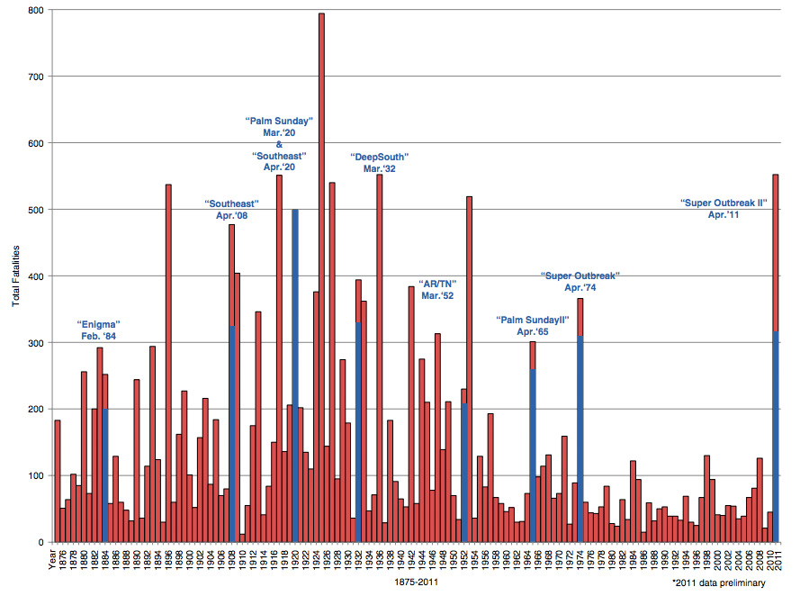 La risposta è, ancora, no. Nonostante nella Tornado Alley abitino più persone che in passato, grazie ai sistemi di allarme sempre più rapidi ed efficienti il numero dei morti dagli anni ’70 in poi si è molto abbassato – escludendo il 2011: anno in cui ci fu il tornado Joplin, in conseguenza del quale morirono 161 persone, e la serie di gravi tornado di fine aprile nel Sud.