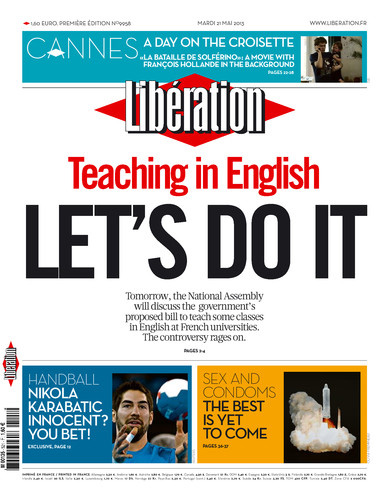 Oggi, martedì 21 maggio, la copertina del quotidiano francese Libération è tutta in inglese. Il titolo di apertura dice: “Teaching in English, let’s do it”. Mercoledì 22 maggio l’Assemblea Nazionale francese discuterà il disegno di legge sull’insegnamento di alcune materie in inglese nelle università francesi, proposta dalla ministra dell’Istruzione superiore e della Ricerca Genèvieve Fioraso per attrarre nelle università francesi studenti stranieri e preparare al meglio gli studenti.