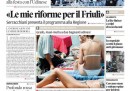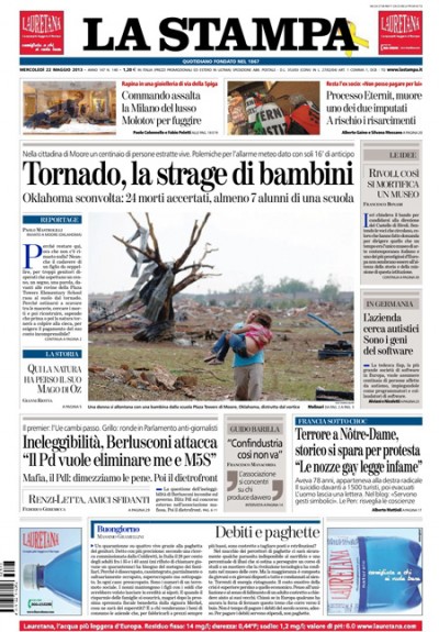 I giornali di oggi aprono con notizie diverse: il tornado in Oklahoma è in apertura sulla Stampa, il Corriere della Sera e il Secolo XIX, Repubblica e l’Unità si occupano invece della proposta del PDL di dimezzare le pene per il concorso esterno in associazione mafiosa, prima presentata e poi ritirata per le proteste degli altri partiti, il Messaggero e il Mattino titolano sul piano del governo di modifica alle pensioni per tutelare gli esodati, il Giornale contesta le mosse del PD sull’ineleggibilità di Berlusconi e sulla legge elettorale, il Fatto e Libero aprono con la decisione della FIAT di spostare in Gran Bretagna la sede fiscale della società dei mezzi pesanti per pagare meno tasse, e il Manifesto si occupa dell’iniziativa del comune di Milano di concedere la cittadinanza a duecento bambini nati in Italia da genitori immigrati.