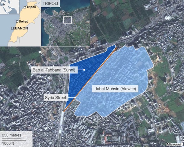 Tripoli è una città a maggioranza sunnita con una piccola comunità di alawiti, concentrata nella zona in cui si sono verificate molte delle violenze di questi ultimi quattro giorni. Secondo la stampa locale gli scontri stanno coinvolgendo soprattutto due quartieri di Tripoli: il sunnita Bab al-Tabbaneh e l’alawita Jabal Mohsen, divisi tra loro da una strada che si chiama “via Siriana” (come si vede bene dall’immagine sotto pubblicata da BBC).