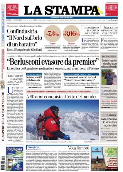 Le notizie che si dividono le aperture sui giornali di oggi sono due: le motivazioni della sentenza di appello con cui è stato condannato Silvio Berlusconi nel processo sui diritti tv di Mediaset, che accusano Berlusconi di aver continuato a guidare l’azienda anche quando era Presidente del Consiglio, e l’allarme lanciato all’assemblea di Confindustria dal Presidente Squinzi, secondo il quale il Nord è “sull’orlo del baratro”. Su tutte le prime pagine si trovano anche le notizie sulle indagini sull’uccisione di un soldato a Londra da parte di due persone armate di coltelli.