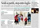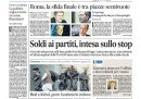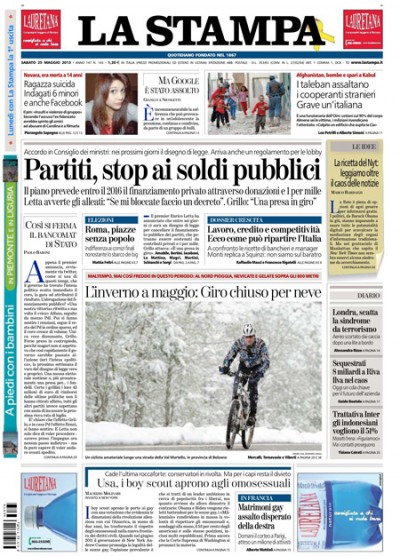 I giornali di oggi aprono con notizie diverse: molti con l’annuncio del Presidente del Consiglio Letta di aver trovato un accordo con la maggioranza per l’abolizione del finanziamento pubblico ai partiti, il Corriere della Sera, Avvenire e il Secolo XIX titolano sull’assalto a una sede dell’ONU a Kabul in cui è stata gravemente ferita una funzionaria italiana, il Messaggero, il Manifesto e l’Unità si occupano delle elezioni amministrative di domani, concentrandosi sul voto a Roma. I quotidiani sportivi aprono con la scelta di Mazzarri come nuovo allenatore dell’Inter, al posto di Stramaccioni.