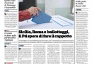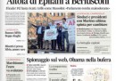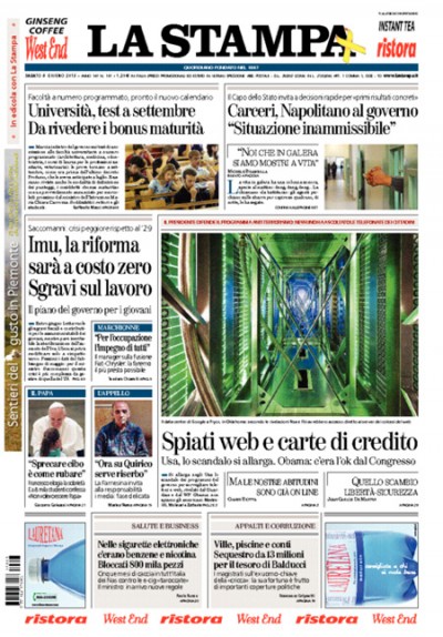 Oggi sono diverse le notizie di cui si occupano i giornali: il caso PRISM e le dichiarazioni di Obama sui controlli online da parte del governo statunitense, le polemiche sulle parole di Beppe Grillo sul Parlamento, definito una “tomba maleodorante”, l’allarme per le imprese da parte del convegno dei giovani industriali, il rinvio a settembre dei test per l’ammissione alle università a numero chiuso, e l’attesa per i ballottaggi per i sindaci di domani. I quotidiani sportivi commentano il brutto pareggio fra Italia e Repubblica Ceca, con l’espulsione di Balotelli, per le qualificazioni ai mondiali in Brasile dell’anno prossimo.