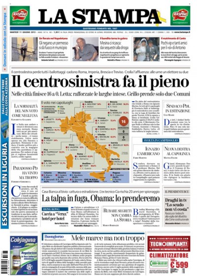 I giornali di oggi aprono tutti con i risultati dei ballottaggi per le elezioni dei sindaci con la vittoria di Ignazio Marino a Roma e dei candidati del centrosinistra in tutte le città maggiori, e Libero e il Giornale sottolineano come il centrodestra senza la presenza di Berlusconi alle elezioni perda. L’altra notizia presente su molte prime pagine è la fuga dell’ex tecnico della CIA responsabile delle rivelazioni sul caso dei controlli sulle comunicazioni online da parte del governo statunitense.