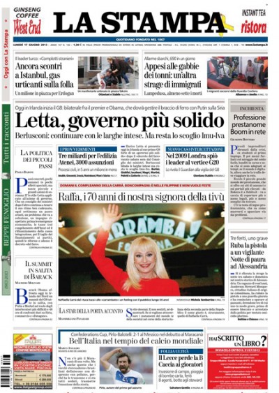 I giornali di oggi hanno notizie diverse in apertura: lo stato di salute del governo Letta dopo l’approvazione del “decreto fare”, i suoi prossimi obiettivi e le dichiarazioni di Silvio Berlusconi di sostegno alle larghe intese sulla Stampa, il Messaggero, il Secolo XIX, l’Unità e il Giornale, mentre il Corriere della Sera si occupa della repressione di Erdogan a Istanbul sui manifestanti di Piazza Taksim, e Repubblica titola ancora con le parole del ministro Zanonato che non crede sia possibile evitare l’aumento dell’IVA. I quotidiani sportivi aprono con la vittoria dell’Italia sul Messico nella prima partita della Confederations Cup in Brasile.