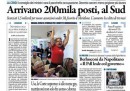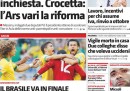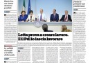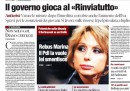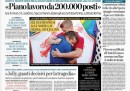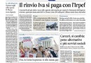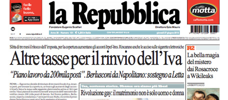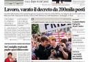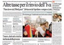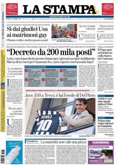 Quasi tutti i giornali di oggi aprono con le decisioni del consiglio dei ministri di ieri: il rinvio di tre mesi dell’aumento dell’IVA, finanziato con l’aumento dell’acconto IRPEF, e il decreto sul lavoro, che nelle previsioni del governo dovrebbe portare duecentomila nuovi posti di lavoro. Avvenire apre invece criticando la decisione della Corte Suprema degli Stati Uniti di consentire il matrimonio anche fra persone dello stesso sesso, il Giornale titola sull’incontro fra Berlusconi e Napolitano e sulle condizioni del PDL per proseguire nel sostegno al governo Letta, il Manifesto si occupa della mozione approvata ieri dalla Camera che rinvia l’acquisto degli F35 e lo vincola all’approvazione da parte del Parlamento, e il Fatto pubblica i verbali dell’inchiesta di Napoli sulla compravendita dei senatori che ha come imputato Berlusconi.