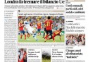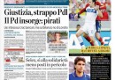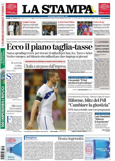 I giornali di oggi aprono con notizie diverse: Repubblica, il Corriere della Sera, l’Unità e il Secolo XIX si occupano dell’emendamento presentato dal PDL al Senato che vorrebbe che la commissione per le riforme si occupi anche di giustizia, la Stampa presenta il piano del governo per ridurre le tasse dopo l’estate, il Messaggero e il Mattino aprono con il piano di controlli dell’Agenzia delle Entrate per recuperare l’evasione fiscale, e il Giornale titola sull’attacco di Brunetta ai ministri economici del governo Letta. I quotidiani sportivi aprono con i complimenti alla nazionale italiana per la bella partita contro la Spagna nelle semifinali di Confederations Cup, finita con la sconfitta per 7-6 ai rigori.
