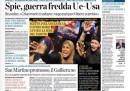 La maggior parte dei giornali di oggi apre con le tensioni fra Europa e Stati Uniti per la vicenda delle intercettazioni americane sulle comunicazioni delle ambasciate europee a Washington e all’ONU, che potrebbe mettere a rischio i negoziati per il libero scambio. Il Messaggero e il Giornale si occupano invece della salute del governo Letta, il primo con un’intervista a Alfano che rassicura sulla durata del governo, il secondo mette in guardia sui possibili ostacoli che dovrà affrontare la maggioranza che lo sostiene. I quotidiani sportivi aprono con la conclusione della Confederations Cup, vinta dal Brasile in finale sulla Spagna, e con la vittoria dell’Italia sull’Uruguay ai rigori nella finale per il terzo posto.