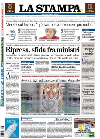 I giornali di oggi hanno notizie diverse in apertura: il Corriere della Sera, Avvenire e il Manifesto seguono la situazione in Egitto e la tensione fra il presidente Morsi, i militari e le manifestazioni di piazza, Repubblica, l’Unità e il Secolo XIX aprono con le parole di Renzi, che in vista del congresso del PD chiede ai capicorrente di smetterla con il “tiro al piccione” nei suoi confronti, la Stampa, il Messaggero, il Fatto e Libero si occupano della situazione economica, con la differenza di vedute fra i ministri Zanonato e Saccomanni sulla ripresa, e il Giornale titola sul rinvio dell’elezione di Santanchè a vicepresidente della Camera, dopo il mancato accordo fra PD e PDL.