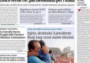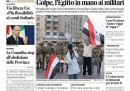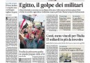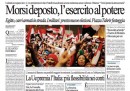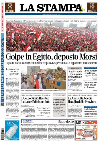 Quasi tutti i giornali di oggi dedicano l’apertura all’intervento dei militari in Egitto, che hanno deposto il presidente Morsi, sospeso la costituzione e promesso di indire presto nuove elezioni. Gli unici a fare una scelta diversa sono il Sole 24 Ore, che si occupa della decisione dell’Unione Europea di concedere una maggiore flessibilità all’Italia sui vincoli di bilancio, il Tempo, che apre sulla bocciatura da parte della Corte Costituzionale del decreto che stabiliva la riduzione delle province, il Mattino, che titola sull’indagine a Napoli che vede 53 consiglieri regionali indagati per i rimborsi, e Libero, che critica il governo Letta per gli incarichi assegnati dal suo insediamento e per il rinvio delle decisioni importanti.