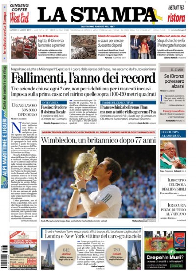 Il PDL contro Saccomanni per l'IMU, l'attesa per il Papa a Lampedusa, e la vittoria di Murray a Wimbledon