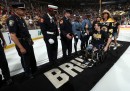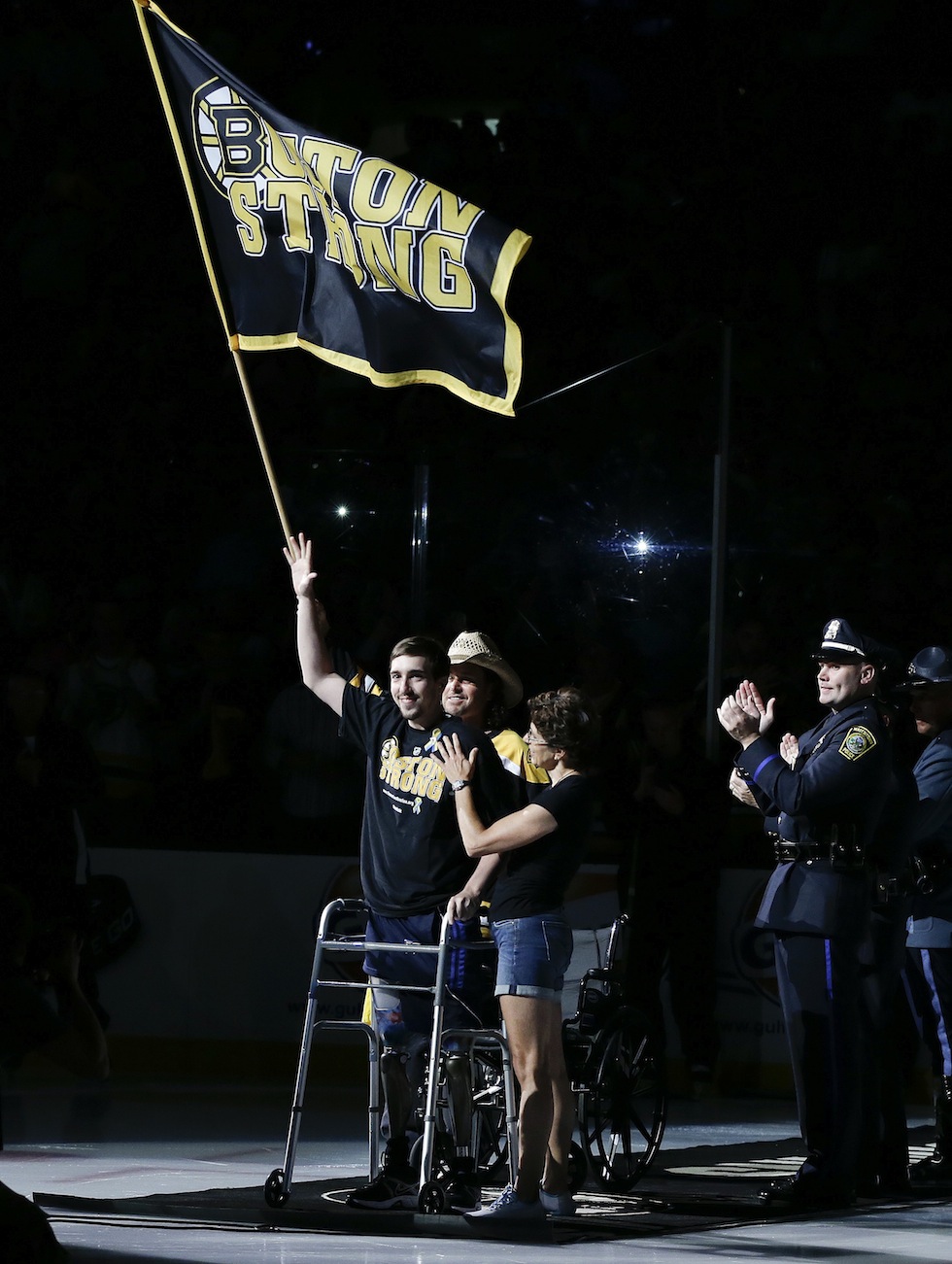 Il 24 giugno, due settimane fa, Jeff Bauman e Carlos Arredondo hanno salutato i tifosi dei Boston Bruins prima della finale della Stanley Cup di hockey contro i Chicago Blackhawks. Jeff Bauman è entrato in campo sulla carrozzina insieme alla fidanzata, e poi si è alzato in piedi.