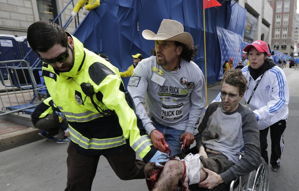 Bauman si ritrovò sdraiato a terra sul marciapiede, stordito. Si tirò su, c’erano puzza e fumo. Vide a terra anche una delle coinquiline della sua fidanzata: lei fece come per muoversi verso di lui ma le sue gambe erano messe malissimo e non rispondevano. Si guardarono, dall’alto verso il basso e poi di nuovo verso l’alto, e inorridirono, tutti e due. Dalle ginocchia in giù le gambe di Bauman non esistevano più: c’erano brandelli sfilacciati di muscoli, tessuti e ossa. Si gettò indietro, contorcendosi, e poco dopo fu trovato da Allan Panter, un medico che era tra il pubblico della maratona ed era rimasto illeso. Panter tirò su Bauman, gli rimise dentro le gambe quello che era finito fuori, gli strinse un pezzo di stoffa attorno alla gamba destra, che era quella messa peggio, e gli diede una giacca. Poi scappò verso un’altra ragazza, le cui condizioni gli sembravano ancora più gravi: era immobile, con gli occhi aperti e vuoti. Bauman resto lì e pensò: sto morendo.